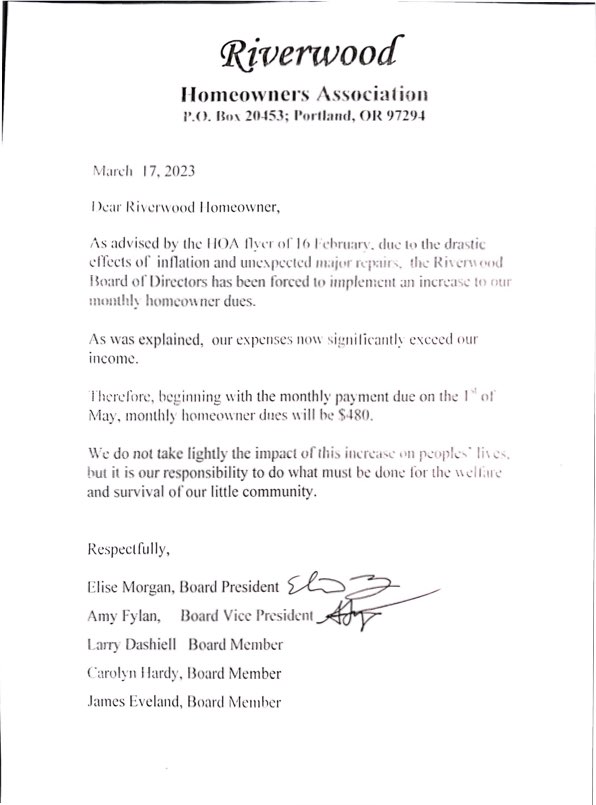 As advised by the HOA flyer 16 February, due to the drastic effects of inflation and unexpected major repair, the Rivenwood Board of Directors has been forced to implement an increase to our monthly homeowner dues.